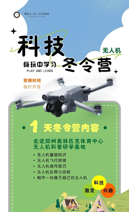 鄭州奧體翼能無人機(jī)研學(xué)基地是集無人機(jī)科普、研學(xué)、開發(fā)、應(yīng)用、賽事運(yùn)營的綜合服務(wù)平臺,不僅擁有1000余平方米的無人機(jī)科普教育基地,還擁有無人機(jī)駕駛執(zhí)照的培訓(xùn)資格。寒假期間,依托鄭州奧體中心開闊場館,翼能無人機(jī)將科普知識與實(shí)操表演完美結(jié)合,分別開設(shè)1至5天不等的科技冬令營,代領(lǐng)孩子們放飛科技夢,在嗨玩中學(xué)習(xí)。