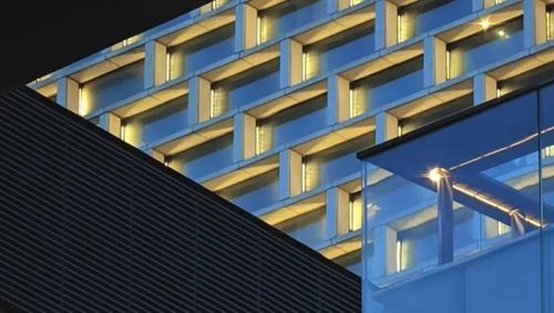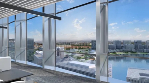 城發(fā)中心以“嵩山書頁巖”為設(shè)計(jì)理念,以中空LOW-E玻璃打造極簡幕墻立面,玻璃寬約3米,隱藏式開啟窗。