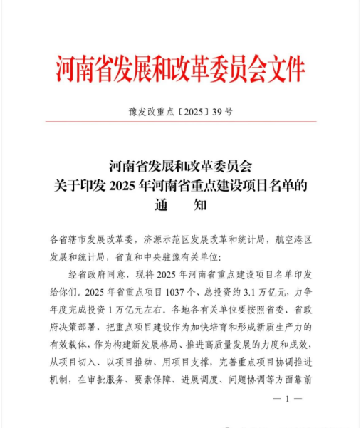 1月20日,河南省發(fā)改委發(fā)布《2025年河南省重點建設(shè)項目名單》。城發(fā)·高新生物經(jīng)濟產(chǎn)業(yè)園名列其中,入選2025年河南省重點建設(shè)項目。2025年省重點項目1037個、總投資約3.1萬億元,力爭年度完成投資1萬億元左右。