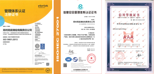 結(jié)合2019年取得的質(zhì)量管理體系(ISO9001),鄭房測(cè)繪已成功通過“三標(biāo)體系”認(rèn)證。這些榮譽(yù),不僅是公司在規(guī)范化運(yùn)營、風(fēng)險(xiǎn)防控、精細(xì)化管理等維度交出的優(yōu)異答卷,更標(biāo)志著公司企業(yè)綜合實(shí)力和核心競(jìng)爭(zhēng)力的增強(qiáng),顯著提升公司品牌形象與市場(chǎng)信譽(yù)度,增強(qiáng)客戶對(duì)企業(yè)的信任,為深耕測(cè)繪地理信息市場(chǎng)奠定堅(jiān)實(shí)基礎(chǔ),為開啟管理升級(jí)與戰(zhàn)略躍升譜寫新篇章。