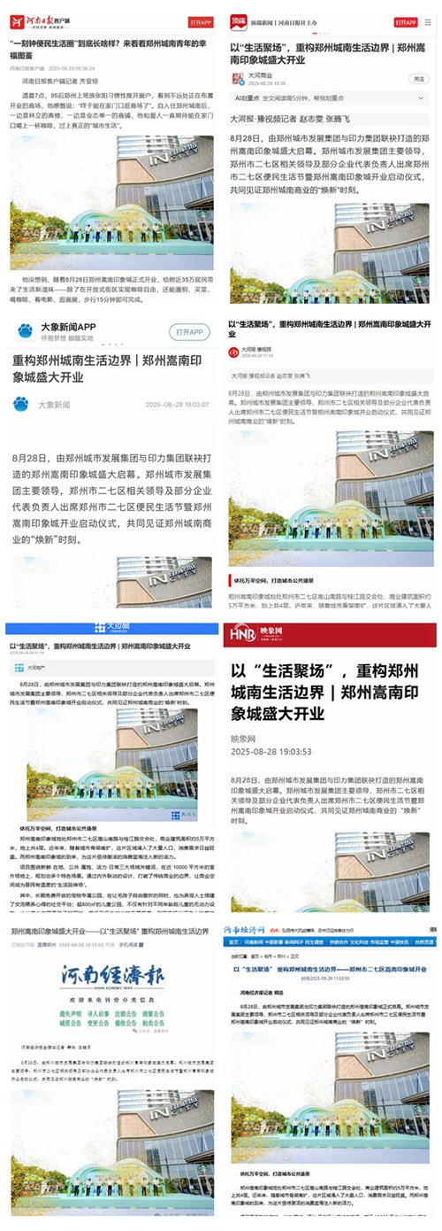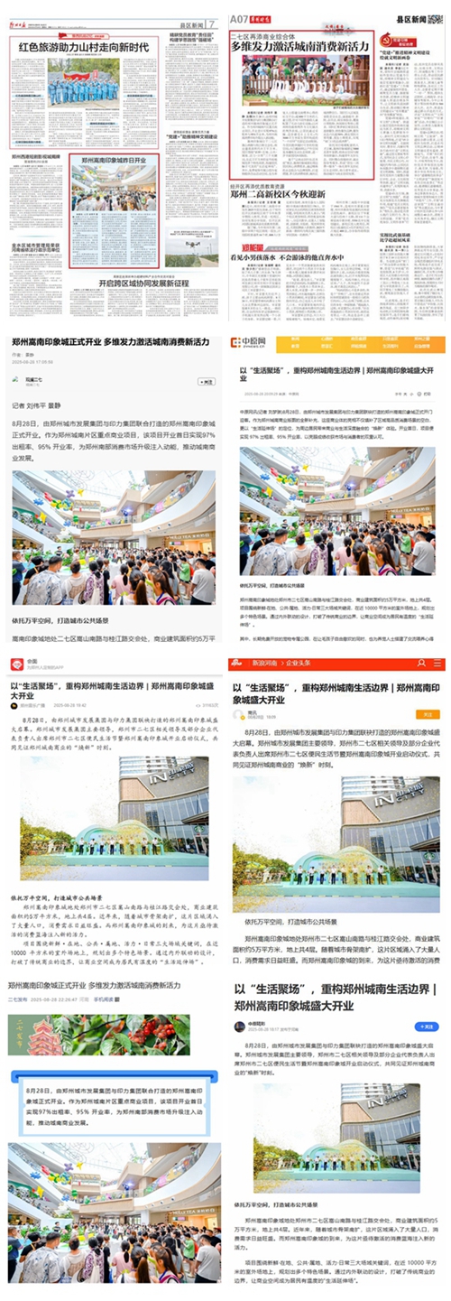 8月28日,鄭州城南商業(yè)格局迎來重大變革,由鄭州城市發(fā)展集團(tuán)與印力集團(tuán)攜手打造的鄭州嵩南印象城盛大啟幕,開業(yè)首日客流達(dá)12.6萬人次,迅速成為全城矚目的焦點(diǎn)。這一盛事引發(fā)了各大媒體的廣泛關(guān)注,河南日報(bào)客戶端、頂端新聞、大象新聞、大河報(bào)、大河網(wǎng)、映象網(wǎng)、河南經(jīng)濟(jì)報(bào)、鄭州日報(bào)、鄭州晚報(bào)、鄭州廣播電視臺(tái)等媒體紛紛聚焦,對其開業(yè)進(jìn)行了全方位、多角度的報(bào)道。