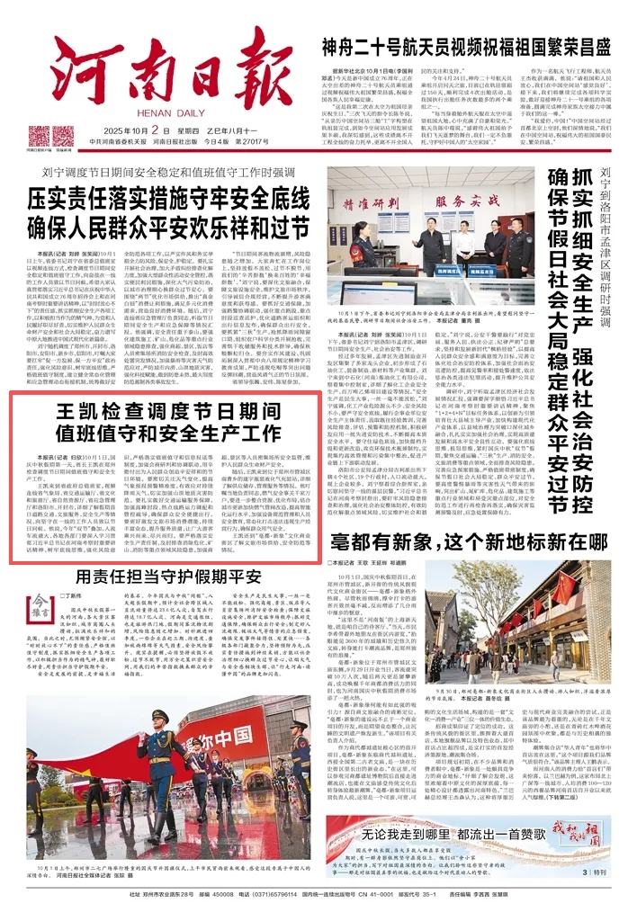 王凱來到省政府總值班室,視頻連線省氣象局、省交通運(yùn)輸廳、省文化和旅游廳、省自然資源廳、省應(yīng)急管理廳和洛陽市、開封市,詳細(xì)了解假期首日道路交通、文旅服務(wù)、安全生產(chǎn)等情況,向堅(jiān)守在一線的工作人員致以節(jié)日問候。他說,今年“雙節(jié)”疊加,人流車流量大,各地各部門要深入學(xué)習(xí)貫徹習(xí)近平總書記在河南考察時(shí)重要講話精神,樹牢底線思維,強(qiáng)化風(fēng)險(xiǎn)意識(shí),嚴(yán)格落實(shí)值班值守和信息報(bào)送等制度,加強(qiáng)會(huì)商研判和協(xié)調(diào)聯(lián)動(dòng),用辛勤付出為人民群眾創(chuàng)造平安祥和的節(jié)日環(huán)境。要密切關(guān)注天氣變化,提高氣象預(yù)報(bào)預(yù)警精準(zhǔn)度,有效應(yīng)對(duì)持續(xù)降雨天氣,切實(shí)加強(qiáng)山洪地質(zhì)災(zāi)害防范。要扎實(shí)做好交通運(yùn)輸服務(wù)保障,加強(qiáng)高峰時(shí)段、熱點(diǎn)線路運(yùn)力調(diào)配和管控疏導(dǎo),確保群眾安全便捷出行。要更好激發(fā)文旅市場消費(fèi)潛能,持續(xù)豐富業(yè)態(tài),提升服務(wù)質(zhì)量,讓廣大游客乘興而來、盡興而歸。要嚴(yán)格落實(shí)安全生產(chǎn)責(zé)任制,及時(shí)排查消除?;?、礦山、消防等重點(diǎn)領(lǐng)域風(fēng)險(xiǎn)隱患,加強(qiáng)商超、景區(qū)等人員密集場所安全監(jiān)管,維護(hù)人民群眾生命財(cái)產(chǎn)安全。
