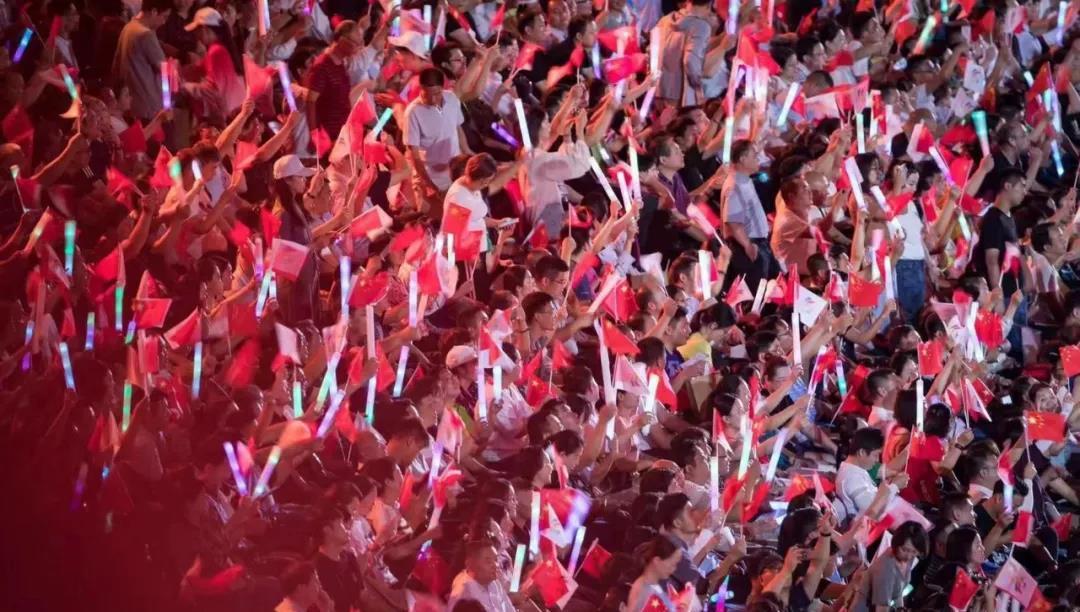 當現(xiàn)場屏幕通過虛擬技術(shù)應用,呈現(xiàn)出美麗的畫面,讓現(xiàn)場觀眾仿佛置身北國北川、南嶺飛瀑之中,觀眾都情不自禁地揮舞起了手中的國旗為他們的表演喝彩!為我們偉大的祖國喝彩!1000架無人機從奧體中心廣場升起迅速變換成中中的造型,點燃民族運動會的火炬。