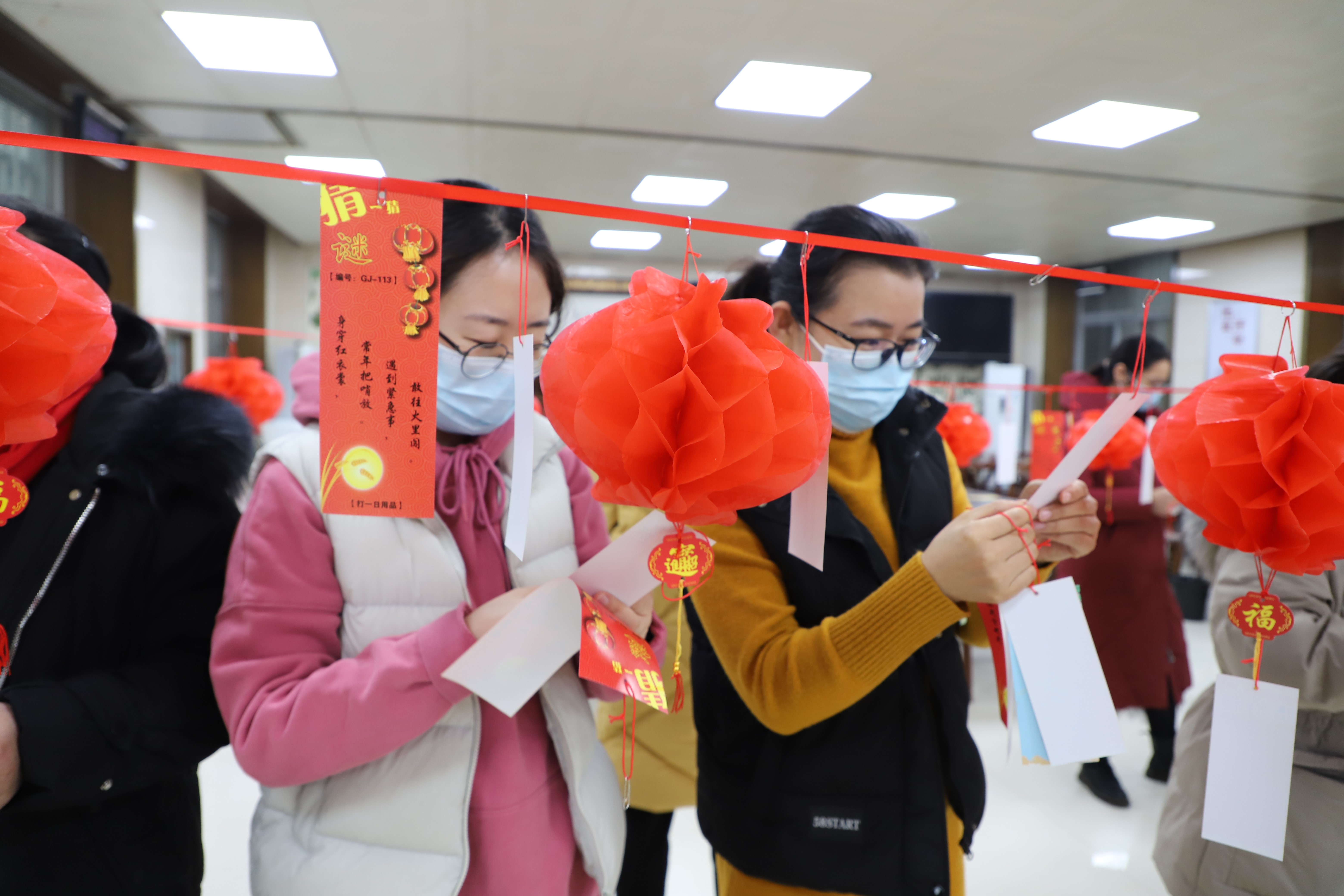 五彩的謎語(yǔ)隨著絲帶來(lái)回?fù)u曳,屋外的飄雪絲毫抵擋不了大家的熱情,妙趣橫生的燈謎讓大家駐足流連,踴躍競(jìng)猜。只見(jiàn)大家手里拿著燈謎,或凝神思考、熱烈探討,或蹙眉頓首,各抒己見(jiàn),歡聲笑語(yǔ)不斷。大家相互切磋交流答案,待猜中謎底,開(kāi)心奔向領(lǐng)獎(jiǎng)臺(tái),共同體驗(yàn)猜謎帶來(lái)的樂(lè)趣。