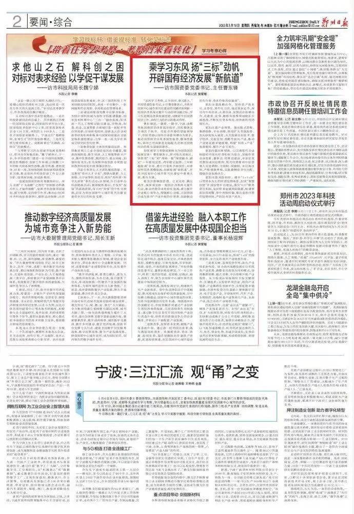 5月18日,《鄭州日報》刊發(fā)市國資委黨委書記、主任曹東鋒專訪文章《乘學習東風 揚“三標”勁帆 開辟國有經濟發(fā)展“新航道”》,為您全文分享如下——